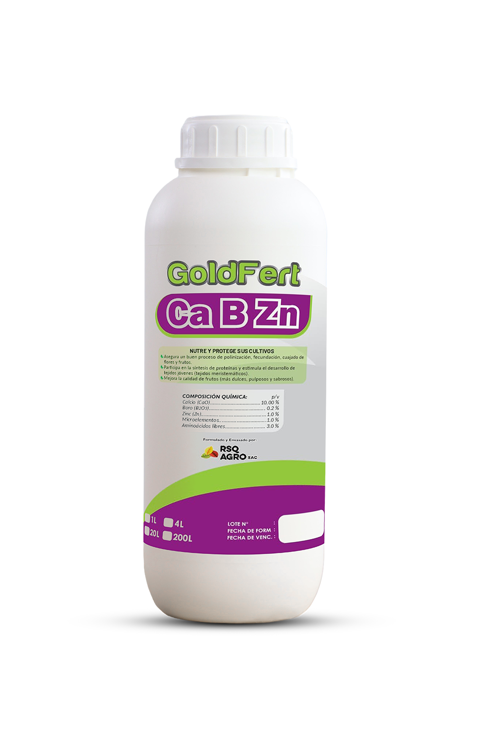 GoldFert Ca-B-Zn es un fertilizante foliar formulado con Calcio, Boro y Zinc para fortalecer paredes celulares, mejorar la polinización y asegurar frutos de mayor vida postcosecha. Su combinación de microelementos favorece un desarrollo equilibrado, mejor cuajado y una producción homogénea.